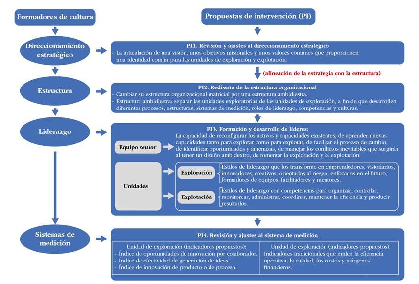 Para lograr una transformación cultural efectiva, se proponen cuatro estrategias clave: 1) revisión y ajustes al direccionamiento estratégico, mediante la articulación de una visión, unos objetivos misionales y valores que proporcionen una identidad común para las unidades de exploración y explotación; 2) rediseño de la estructura organizacional, cambiando su estructura organizacional matricial por una estructura ambidiestra; 3) formación y desarrollo de líderes, con estilos de liderazgo específicos para la unidad de exploración, para la unidad de explotación y para la conformación del equipo senior integrador, y 4) revisión y ajustes al sistema de medición, con indicadores particulares para la unidad de exploración y para la unidad de explotación, entre otros ajustes.