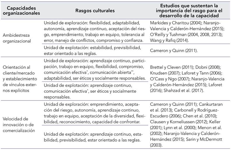 La mayoría de los estudios cuyo objetivo ha sido analizar la relación entre cultura e innovación se han enfocado en evaluar solo el efecto de algunos de los rasgos y comportamientos de la cultura organizacional en la innovación (Akman & Yilmaz, 2008; Arad et al., 1997; Cai et al., 2015; Cifuentes Sánchez & Londoño Londoño, 2017; Dobni, 2008; Dombrowski et al., 2007; Laforet, 2016; Martins & Terblanche, 2003; O'Cass & Ngo, 2007; Solarte et al., 2020; Taghizadeh et al., 2020; Tuschman & O'Reilly, 1997). Por otro lado, pocos autores han estudiado la cultura de la innovación como un constructo dimensional o factorial, es decir, han realizado análisis mucho más profundos, a partir de los cuales han diseñado modelos que incluyen dimensiones o factores culturales para explicar la relación entre cultura organizacional e innovación (Asmawy & Mohan, 2011; Brettel & Cleven, 2011; Chen, 2011; Dobni, 2008; Duygulu et al., 2015; Felizzola & Anzola-Morales, 2017; Martins & Terblanche, 2003; Rao & Weintraub, 2013; Sharifirad & Ataei, 2012; Shahzad et al., 2017).