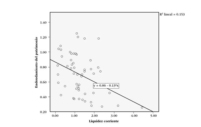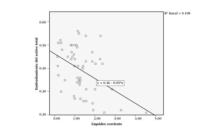 Figura 2 Modelo de regresión lineal para liquidez corriente y endeudamiento del activo total