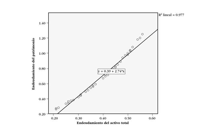 Figura 6 Modelo de regresión lineal para el endeudamiento del activo total y el endeudamiento del patrimonio