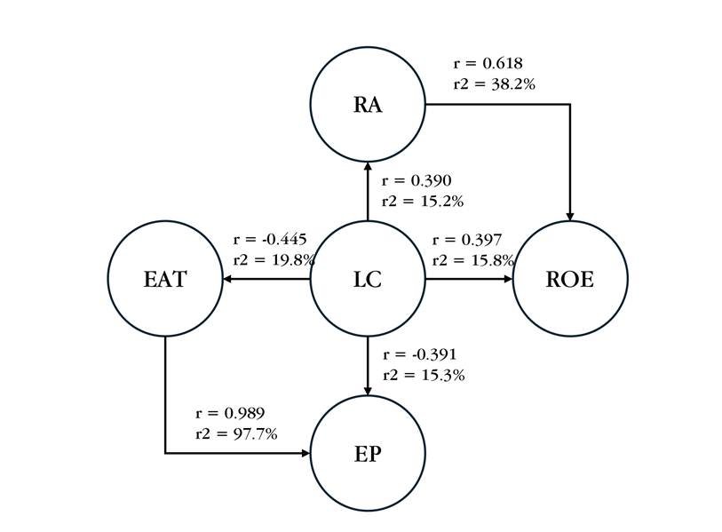 Como se observa en la tabla 9, se halló una correlación significativa y positiva media entre el indicador LC y los indicadores RA y ROE. Por otro lado, el indicador LC presenta una correlación significativa y negativa media con los indicadores financieros EAT y EP. Además, el indicador RA muestra una correlación significativa y positiva considerable con el ROE. Por su parte, el indicador EAT tiene una correlación significativa y positiva perfecta con el indicador EP (Hernández et al., 2014).