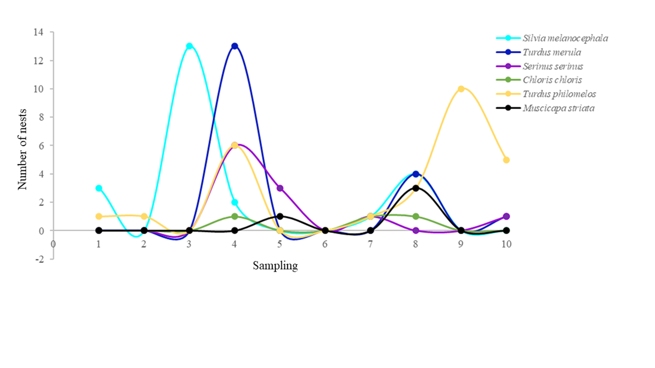A total of 98 nests belonging to six bird species were found (Table 2), and simultaneous nests with a maximum of three species were observed in the same host. The number of nests varied among species (t=4.169; p=0.001). Turdus philomelos, Silvia melanocephala and Turdus merula were the species that built the highest number of nests, while Chloris chloris and Muscicapa striata built the fewest, with a percentage of 5.1% and 4.1%, respectively (Figure 1). The six bird species presented different nesting strategies (Figure 1). T. philomelos increased the number of nests as sampling time increased, while C. chloris and M. striata maintained a constant number of nests. S. melanocephala, T. merula and S. serinus decreased the number of nests as sampling time increased (Figure 1).