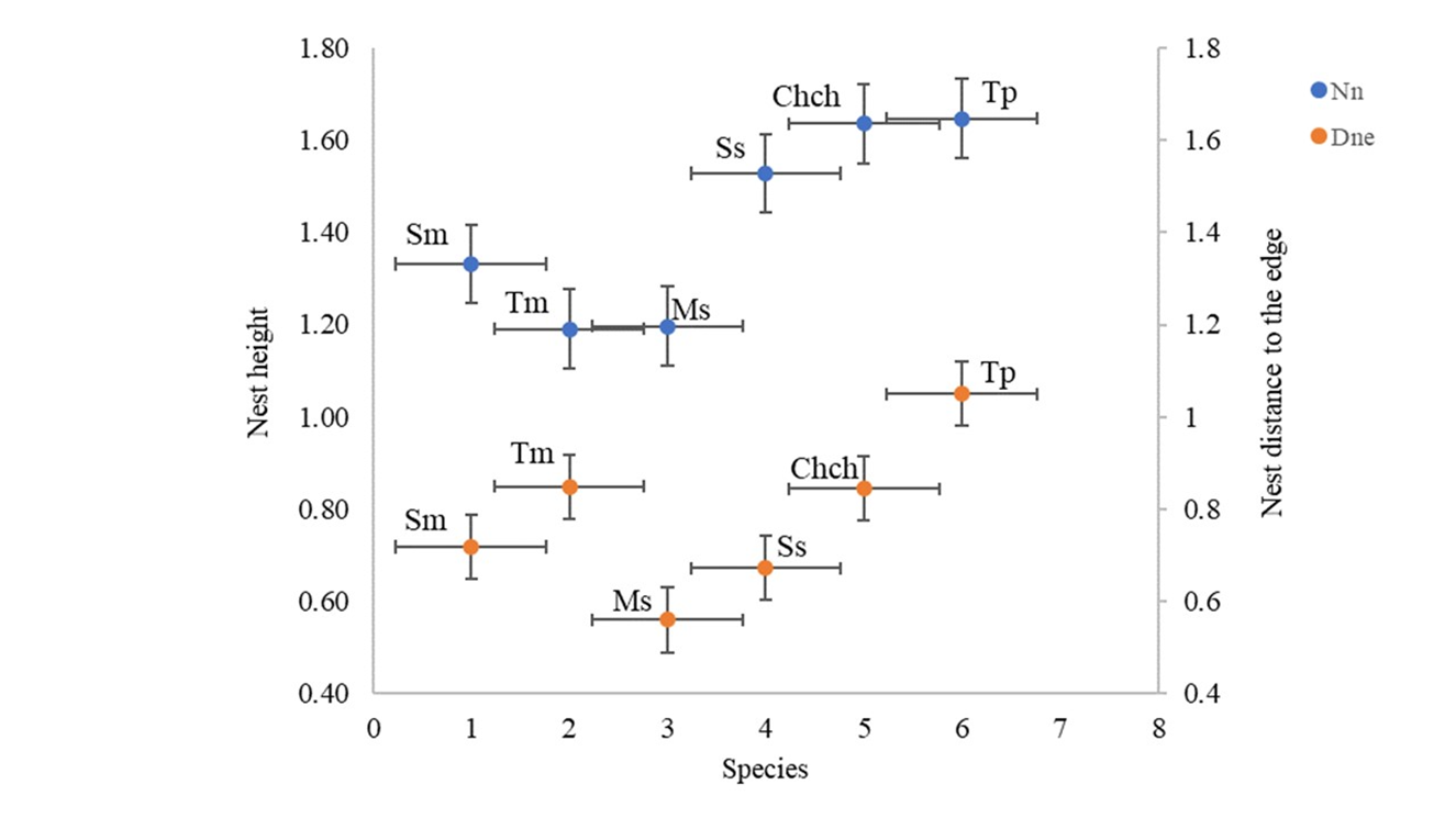 Figure 2 Vertical distribution of nests of the six bird species in relation to height and distance from nest to edge in orange trees. Nh: nest height; Dne: distance from nest to edge. Sm= Silvia melanocephala, Tm=Turdus merula, Ss=Serinus serinus, Cch=Chloris chloris, Tp=Turdus philomelos, Ms=Muscicapa striata.