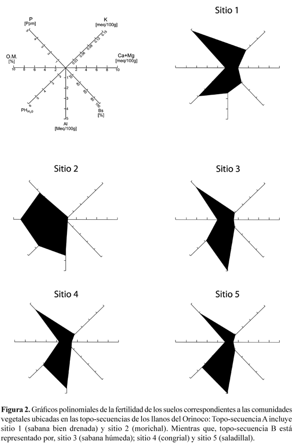La composición física y la química de los suelos de las topo-secuencias reflejaron las diferencias del material parental. La fertilidad de los suelos correspondientes a las topo-secuencia A y B fue representada mediante gráficos poligonales propuesto por Alvin & Rosand (1974) (Figura 2).