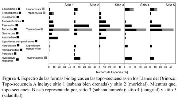 El espectro de las formas biológicas descritas en las dos topo-secuencias de los Llanos del Orinoco, reflejó principalmente las adaptaciones de las especies al factor hídrico. En las comunidades sujetas a condiciones de inundación, las formas biológicas Hydrophyta radicantia y Hidronatantia están muy bien representadas. El espectro de las sabanas bien drenadas, contrastó con el de las comunidades temporal y permanentemente inundadas. La duración e intensidad de las condiciones de inundación controlaron la presencia de los elementos leñosos. El exceso hídrico es considerado generalmente restrictivo para el crecimiento de las plantas (Schueler & Holland 2000). Sin embargo, los elementos leñosos característicos del morichal (sitio 2), congrial (sitio 4) y saladillal (sitio 5) presentan adaptaciones fisiológicas y morfológicas a las condiciones de inundación (Parolin 2009) que son convenientes destacar. Fernández et al. (1999) ha reportado que el aparato fotosintético de Acosmium nitens, Symmeria paniculata Benth. y Eschweilera tenuiflora (O. Berg) Miers en las planicies inundables del río Manapire, Venezuela, permaneció integral después de 4 meses de inundación. Las hojas sumergidas se mantuvieron funcionando y contribuyeron con el balance de carbono de las plantas. Herrera et al. (2009) reportó la aclimatización fotosintética en las especies A. nitens, Campsiandra laurifolia Benth, Duroia fusifera Hook. f. y Pouteria orinoensis (Aubrev.) Penn. Marin et al. (1998) midieron los cursos temporales diarios de conductividad estomática en A. nitens, con una media diaria de 1.19 ± 0.38 cm/s, y en C. llanorum de 0.45 ± 0.28 cm/s, los cuales fueron significativamente mayores durante la temporada húmeda. Los autores reportaron valores de potenciales hídricos en A. nitens, los cuales fueron menores en la temporada húmeda y en ningún caso alcanzaron valores < -2.0 MPa. Dezzeo et al. (2003) determinó que en los bosques inundables del río Mapire, Venezuela, la formación de anillos de crecimiento en las especies leñosas (e.g., A. nitens, C. laurifolia, P. orinocensis y Psidium densicomun DC.) ocurre durante los meses de la temporada seca (Noviembre Mayo). Similarmente, Worbes (1997) ha registrado que la producción de biomasa en especies leñosas en las planicies de anegamiento Centrales del Amazonas ocurre durante la fase terrestre. A pesar de las diferencias observadas en el espectro entre las comunidades inundables y no inundables, las especies anuales (Teroculmi y Teroherbae) fueron comunes, al completar su ciclo de vida mediante la latencia de sus semillas. Similares resultados han sido reportados por Linderman (1953) para humedales de Suriname, el río Delaware (EE.UU.) y en los Llanos del Orinoco (Leck & Simpson 1987, Montes & San José 1995).