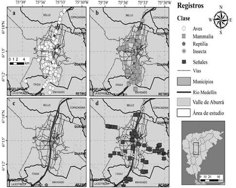 Figura 1 Distribución geográfica de los atropellamientos de fauna silvestre entre 2016 y 2017 registrados en el Valle de Aburrá para cada uno de los organismos encontrados. También se sitúan las señales de tránsito ubicadas previas al estudio en la zona, particularmente en la ciudad de Medellín.