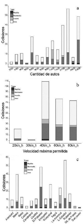 El incremento en la cantidad de autos estuvo relacionado con la cantidad de atropellamientos (F = 3,95, df = 13, P < 0,01, Fig. 2a). Según la clasificación de las vías, no existe una diferencia significativa en relación de la velocidad permitida con los atropellamientos (F = 1,41, df = 4, P > 0,05) (Fig. 2b). Se encontraron registros en once comunas de la ciudad de Medellín (Aranjuez, Castilla, El Poblado, Guayabal, La América, La Candelaria, Laureles-Estadio, Robledo, San Antonio de Prado, San Javier y La Floresta) y cuatro municipios adicionales (Envigado, Itagüí, Caldas y Bello). El número de atropellamientos entre comunas varía significativamente (F = 6,40, df = 16, P < 0,01). Particularmente hay diferencias entre las comunas Laureles-Estadio, El Poblado, y Belén con 57, 49 y 40 registros respectivamente; frente a las localidades de San Javier, municipio de Caldas y Niquía con uno, dos y dos registros respectivamente (Fig. 2c).