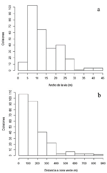 Por su parte, el ancho de la vía es un factor relacionado con las colisiones de fauna (F = 7,57, df = 8, P < 0,01), donde el 63,2 % de las colisiones se encuentran en zonas con una amplitud entre 5 y 15 m (Fig. 3a). Asimismo, la distancia al centro de la zona verde más cercana es un factor significativo (F = 5,9, df = 15, P < 0,01). Se encontró una influencia de la distancia hasta los aproximadamente 275m entre la vía y la zona verde (Fig. 3b), con mayor cantidad de atropellamientos (57 individuos) a una distancia promedio de 125 m y una consecuente disminución a partir de los 400 m de distancia.