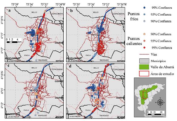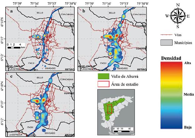 La posición de las áreas de mayor densidad no varía al incrementar el ancho de banda (Fig. 4). Estas zonas se encuentran ubicadas principalmente sobre la vía Regional al norte, entre los municipios de Medellín y Bello, en la parte central del municipio de Medellín a la altura de la Universidad Nacional. Asimismo, se observa un área en la parte occidental de Medellín y un agrupamiento menor en el suroriente, zona correspondiente a El Poblado en límites con el municipio de Envigado.