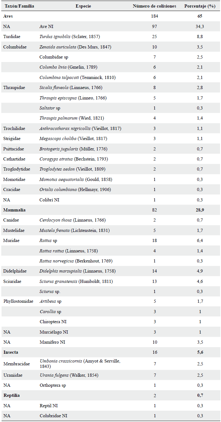 En total se obtuvieron 283 registros de atropellamientos (Tabla 1), sin contar los aproximadamente 900 registros adicionales correspondientes a la polilla migratoria Urania fulgens, los cuales se dieron durante su época de migración en 2016. Se recopilaron 66 registros de colisiones por la vía Regional y la ciclovía que recorre la Av. El Poblado. El resto de los registros se obtuvo en la aplicación mencionada. La cantidad total de registros de aves atropelladas fue de 184 individuos, seguido por 82 individuos de mamíferos, 15 de insectos y dos de reptiles. Los vertebrados con el mayor número de individuos que colisionaron con autos fueron Turdus ignobilis (25), Rattus sp (18), Didelphis marsupialis (14), Sciurus granatensis (13) y Zenaida auriculata (10). No obstante, el número de aves sin identificar fue mayor (97 colisiones: Tabla 1).