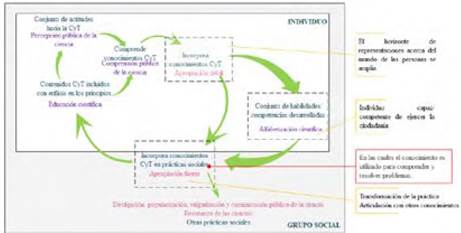 La apropiación social ha sido concebida como una dinámica social y pú blica manifestada en prácticas con tres enfoques particulares: aquellas que relacionan a la ciencia como un bien público, otras que la asocian a un con texto social o cultural y algunas que la vinculan con la importancia y uso de la ciencia para el desarrollo; asimismo, pueden referir a procesos anteriormente denominados de otras formas tales como de comunicación pública o de popularización y de alfabetización en otros contextos (Lozano Borda & Pérez Busto, 2012). En este trabajo la apropiación se entiende como la incorporación de representaciones científicas y tecnológicas en los individuos (denominada apropiación débil) y como la incorporación de esos conocimientos científi co-tecnológicos en las prácticas sociales (sanitarias, educativas, productivas, etc.) teniendo por objetivo la comprensión y resolución de problemas concre tos llevándolas a la transformación (denomina apropiación fuerte) (Olivé, 2011) como se muestra en la figura 1.