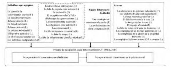 Sobre los factores asociados a esta categoría, se encontraron las mismas ca racterísticas identificadas con la literatura, pero además se halló que la falta de comprensión del conocimiento se asocia con la complejidad del conoci miento CyT a apropiar (de la temática estudiada), generando un nuevo posible factor que afecta el proceso de apropiación social.