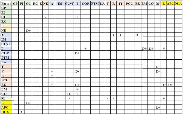 Asimismo, conforme a lo explorado en los casos (ver figura 5) y a lo iden tificado en la revisión de literatura (ver figura 6), se halló la existencia de relaciones entre algunos factores de causa (símbolo + o -) o efecto (D más símbolo + o -), es decir que un factor según un segmento codificado o lo mencionado por un entrevistado puede ser influenciado por otro para que se genere o puede desencadenar otro factor. De esta forma, por ejemplo, en la figura 5 el más en la intersección entre comprensión del conocimiento (CC) y lenguaje (L) significa que la comprensión del conocimiento se causa gracias a un lenguaje adecuado; ahora, el D- en la intersección entre nivel educativo (NE) y comprensión del conocimiento (CC) significa que un bajo nivel educati vo desencadena la falta de comprensión del conocimiento. Cabe resaltar que las relaciones se registraron de acuerdo con la forma como se presentaba el factor: como facilitador (+) o limitante (-).
