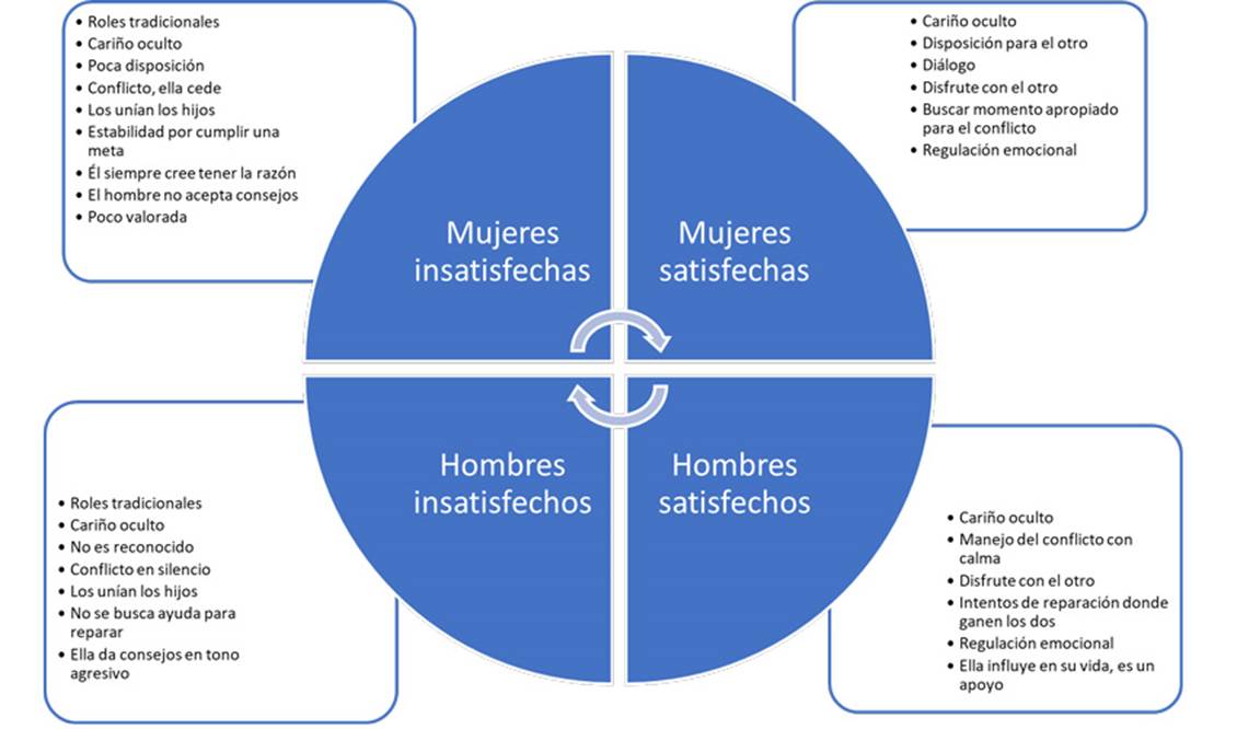 Asimismo, las mujeres satisfechas consideran que es fundamental el respeto en el trato, hacer silencio cuando están muy molestas o irse de la habitación y volver a la conversación cuando ya están más calmadas. Afirman que con los años han aprendido a no molestarse tan fácil por pequeñas cosas. Consideran que el diálogo es la principal herramienta para solucionar sus conflictos:
