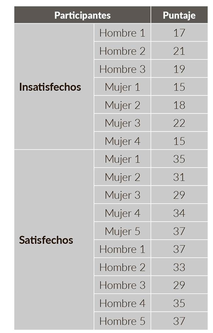 Previo al trabajo de campo para la realización de las entrevistas a profundidad, y con el fin de conformar los dos grupos de participantes, se aplicó un cuestionario que evaluó el nivel de satisfacción marital (Barrera, 2002). Los que arrojaron un puntaje superior a la media (m = 27,29) se ubicaron en el grupo de los matrimonios satisfechos, y los que arrojaron un puntaje inferior se ubicaron en el grupo de los matrimonios insatisfechos (tabla 1).