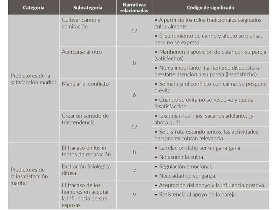 Las categorías que se consideraron más pertinentes por ser a las que más hicieron referencia los participantes se organizaron en dos grupos: 1) predictores de estabilidad y satisfacción marital: cultivar admiración y cariño, acercarse al otro, manejar el conflicto y crear un sentido de trascendencia, y 2) predictores de divorcio o insatisfacción: los fracasos en los intentos de reparación, excitación fisiológica difusa y el fracaso de los hombres en aceptar la influencia de sus esposas.