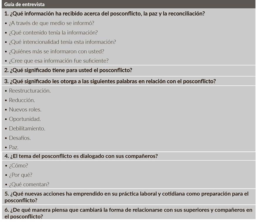 Se construyó una guía de entrevista con preguntas abiertas (tabla 1), con la cual se indagó por las representaciones sociales sobre el conflicto armado. Para su construcción se tuvo en cuenta la revisión documental y el reconocimiento de sitios de trabajo de los militares.