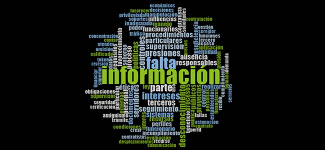 En los informes de los ministerios se puede observar las palabras utilizadas con mayor frecuencia para identificar las causas internas, externas y transversales; se destacan los factores que se relacionan con la información como principales hechos que causan riesgos de corrupción (figura 4.)