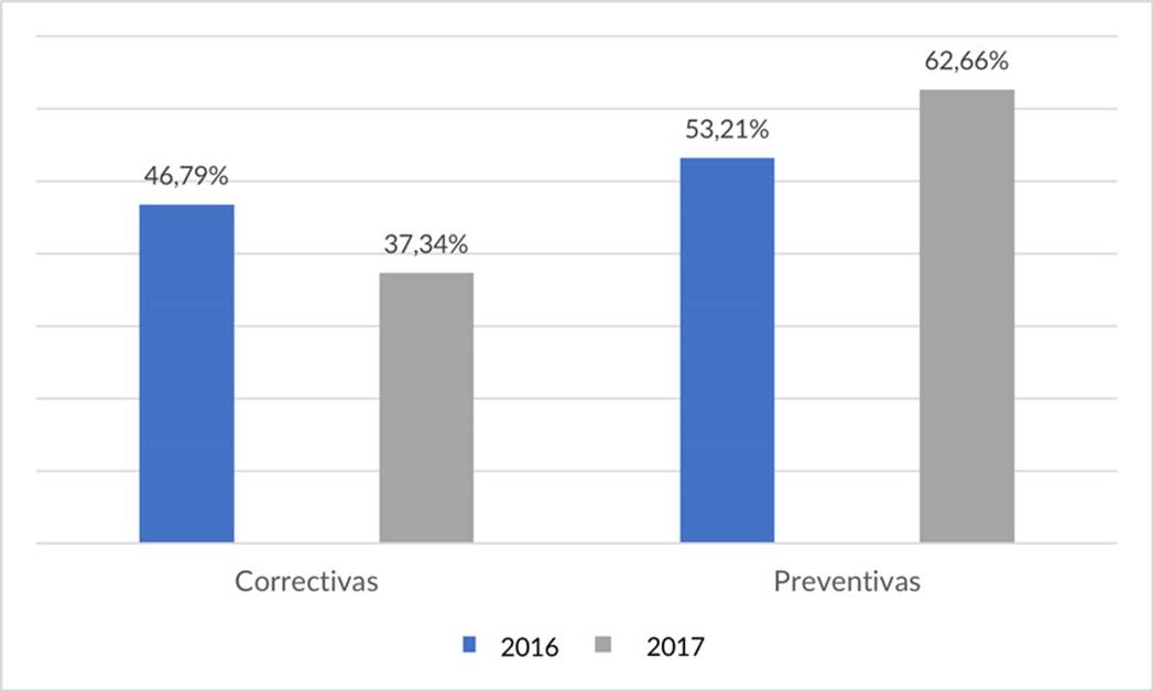 Contrario a lo anterior, en donde los controles correctivos son menores (3,56%), se observa que las acciones correctivas para prevenir y combatir los riesgos de corrupción en 2016 y 2017 son relevantes en la estructuración de los planes anticorrupción (figura 5). Es así como, en 2016, el 46,79 % de las acciones planteadas fueron correctivas y el 53,21 % fueron preventivas. En 2017, las acciones correctivas representaron el 37,34 % y las preventivas el 62,66 %, y las acciones de tipo detectivo no fueron propuestas por los ministerios en sus planes de acción para ninguno de los dos años.