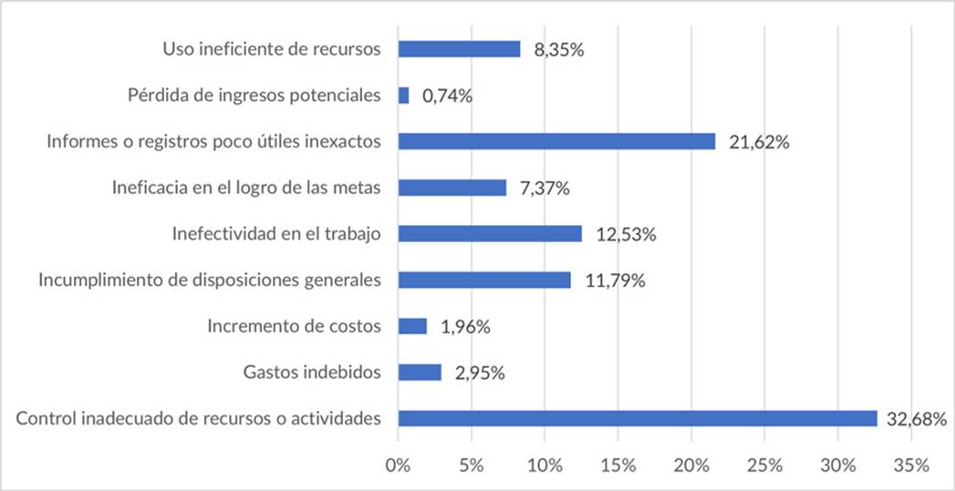 Ahora bien, respecto a los hallazgos que reportó la Contraloría (figura 7), las mayores concentraciones de inconsistencias fueron el control inadecuado de recursos o actividades (32,68 %); los informes o registros poco útiles, poco significativos o inexactos (21,53 %) y la inefectividad en el trabajo (12,53 %). La pérdida de ingresos potenciales (0,74 %) y el incremento de costos (1,92 %) fueron las actividades donde se presentaron menores hallazgos.