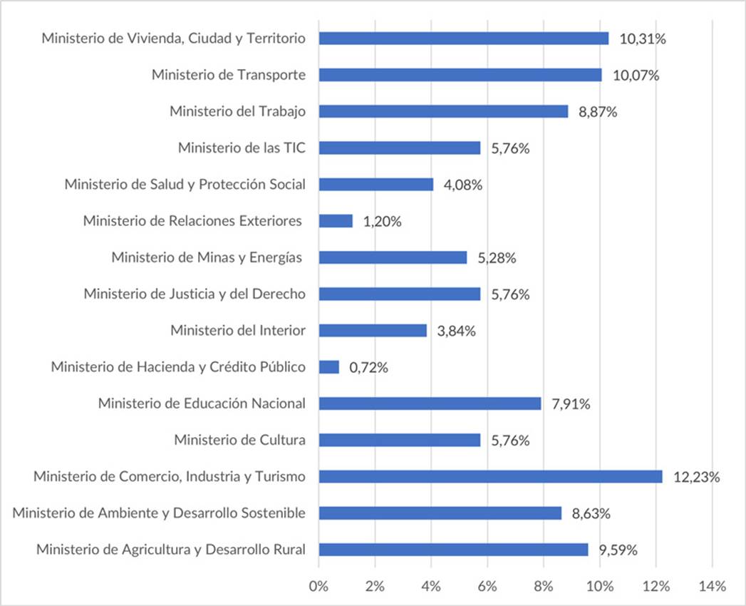 De forma consecutiva, en los informes de auditoría de la CGR se presentaron 407 hallazgos. En figura 8 se observa que el Ministerio de Hacienda y Crédito Público (0,72 %) y el Ministerio de Relaciones Exteriores (1,20 %) tuvieron menos hallazgos, lo cual está relacionado con su calificación de “eficiente” en su evaluación de control interno. Por otra parte, los ministerios que más hallazgos presentaron fueron el Ministerio de Comercio, Industria y Turismo (12,23 %); el Ministerio de Transporte (10,07 %) y el Ministerio de Vivienda, Ciudad y Territorio (10,31 %). Los cuales obtuvieron calificaciones de “con deficiencias” respectivamente.