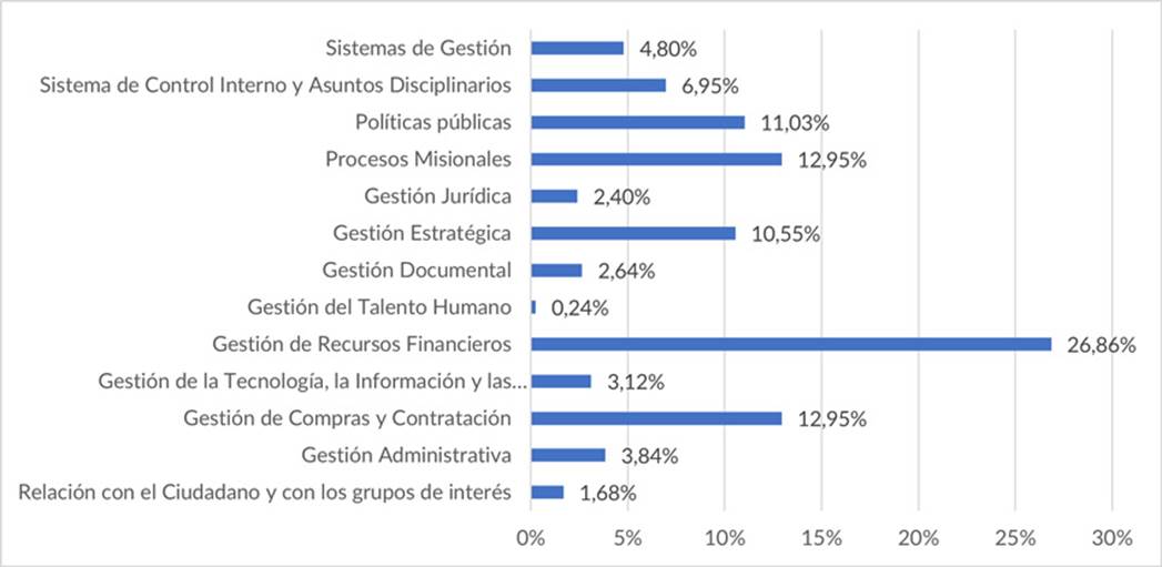 De acuerdo con el sistema de gestión, los procesos de las entidades se clasifican en misionales, de apoyo, estratégicos y evaluación (Centro Latinoamericano de Administración para el Desarrollo, 2008). En la figura 1 se observa que, de acuerdo con los informes, las entidades identificaron una mayor probabilidad de materializarse un riesgo de corrupción en las actividades de apoyo (47,71 %) debido a que estas corresponden a las áreas financieras, gestión de recursos y contratación. Mientras que los procesos de evaluación se consideran como de menor riesgo (9,67 %), estos involucran medidas para prevenir hechos de corrupción, como sistemas de control interno, gestión de asuntos disciplinarios, vigilancia y seguimiento.