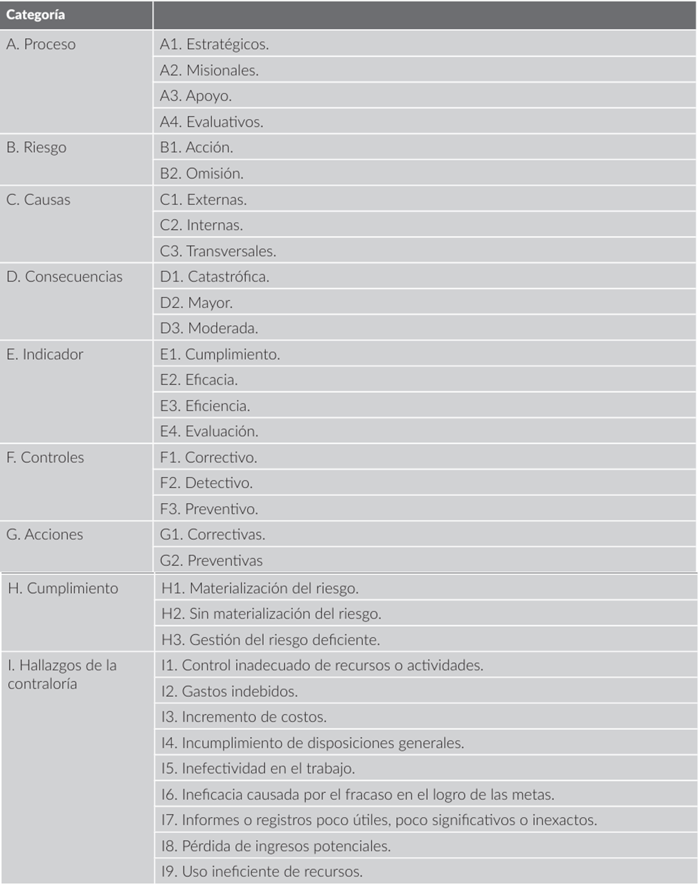 La información recopilada se clasificó como un caso individual por ministerio, lo que permitió cruzar los 773 procesos y los hallazgos que evidenció la Contraloría clasificados por cada proceso y cada ministerio. Para ello se utilizó el software NVivo 12 Plus con el fin de consolidar y analizar los datos. Se establecieron nueve categorías de análisis, que se definieron con base en la estructura planteada por la Guía para la gestión del riesgo de corrupción (Departamento Administrativo de la Función Pública, 2016) para la construcción de la matriz de riesgos de corrupción y la estructura del informe de auditoría establecido en la Guía de auditoría de la Contraloría General de la República (Contraloría General de la República, 2015) (tabla 2).