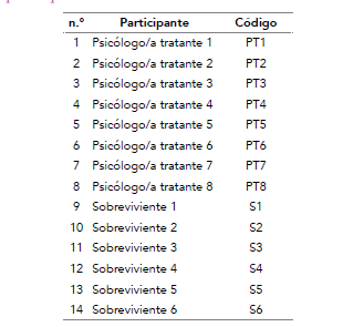 El respaldo de la Red de Sobrevivientes posibilitó el acceso a una muestra de seis personas adultas que, en concordancia con los criterios de inclusión del estudio, reconocen haber vivido experiencias de abuso sexual antes de los 18 años, durante su permanencia en residencias de protección de la Región Metropolitana de Chile. Sus edades se sitúan entre los 30 y los 40 años al momento del estudio. Se trata de cinco sobrevivientes de género femenino y uno masculino. De forma complementaria, entrevistamos a ocho terapeutas de género femenino (entre los 28 y 52 años de edad) quienes, con más de cinco años de experiencia laboral, hubieran trabajado con al menos dos casos de personas que vivieron abuso sexual infantil en residencias de protección. Llegamos a ellas a través de la técnica de bola de nieve (Bryman, 2012). Las profesionales tienen entre 5 y 27 años de experiencia profesional, con una media de 14 años (tabla 1).