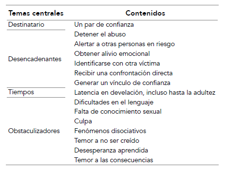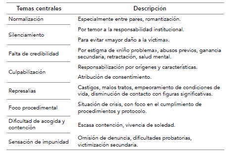Pero la razón más frecuentemente mencionada por las terapeutas fue el temor de las víctimas a las consecuencias que la develación pudiera generar en sus propias vidas. Entre ellas, destaca el miedo al estigma, a sentir que las demás personas les señalan o culpan por los efectos negativos que la develación pudiese generar para la propia institución. En la tabla 2 sintetizamos los principales hallazgos del análisis referido a las experiencias de develación del abuso sexual infantil en contexto residencial.