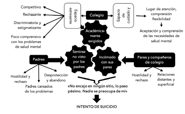 Típicamente, el colegio fue experimentado como un contexto adverso, tanto previo al intento de suicidio como en el proceso de reinserción escolar poshospitalización. Previo al intento, la alta exigencia académica y el ambiente competitivo es vivido como una alta fuente de estrés. A su vez, las interacciones con pares y con algunos docentes son percibidas como rechazantes y poco comprensivas, generando sentimientos de intenso estrés emocional. Así lo describe esta participante: