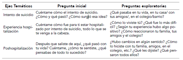 Los datos se recogieron mediante una entrevista presencial semiestructurada según un guion temático (Kvale & Brinkmann, 2009), construida para el estudio marco (tabla 1). Las entrevistas fueron audiograbadas; se realizaron entre 10 y 19 meses después del alta hospitalaria, en el mismo centro asistencial, en un horario definido según la disponibilidad del adolescente y de sus padres. Fueron realizadas en una oficina de atención individual en el mismo centro de salud donde por la investigadora en formación de posgrado en psiquiatría infanto-juvenil y duraron aproximadamente 45-60 minutos.