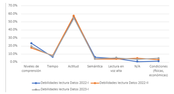 Los factores afectivos permiten u obstaculizan la lectura y la comprensión lectora de los neolasallistas y se reflejan en la actitud, la lectura en voz alta y las respuestas que no indican fortalezas. Tales factores están asociados al gusto y al interés por leer, y se vinculan a los hábitos de lectura de los y las estudiantes (Larrañaga & Yubero, 2005). En 2023-1, el 26.2% de los encuestados relacionó sus dificultades al leer con factores afectivos, identificando una relación entre su interés, su deseo, sus hábitos y sus dificultades al momento de leer. Ellos perciben que carecen del gusto, del interés o del hábito necesario para entender lo que leen, pero, a la vez, reconocen implícitamente un valor social positivo hacia la lectura. Por ejemplo: «Considero que mi mayor debilidad en la lectura es que si no leo algo que me interese o me llame la atención no puedo desarrollar mis fortalezas en la lectura y me distraigo muy rápidamente», o «Mi mayor debilidad es que la lectura suele cansarme o aburrirme de una manera pronta, ya que al no acostumbrar la lectura a mi diario vivir no tengo el interés para continuar concentrado en esta».
