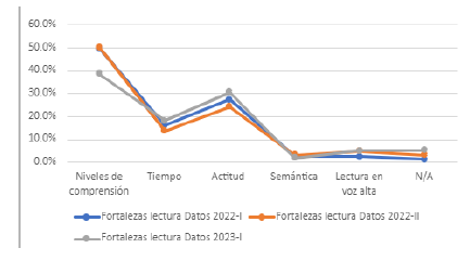 Con respecto a la lectura, se identificaron tres zonas de interés destacadas. La primera es la disposición afectiva al leer: un 26% del estudiantado novel refiere falta de hábito, poco interés o falta de gusto por leer; la segunda es la disposición atencional: el 28% identifica que sus debilidades están relacionadas con la concentración, la atención y la focalización al momento de leer; y la tercera zona es la comprensión del sentido literal de los textos: el 38.7% percibe que sus fortalezas están asociadas con aquella.
