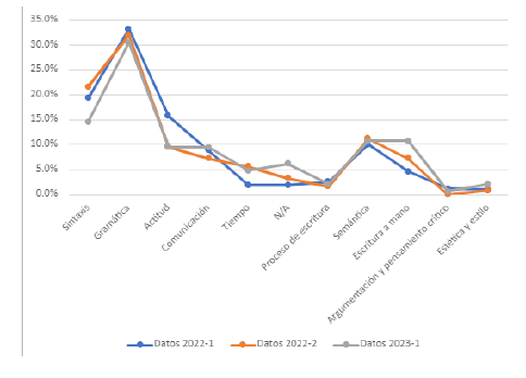 Un 45.92% de los neolasallistas que ingresaron en 2023 dejan ver que, tanto las fortalezas como las debilidades en escritura se dirigen principalmente hacia la gramática (ya sea en puntuación, sintaxis o semántica). Fundamentado en lo anterior se identificó que la escritura se concibe como un proceso de organización formal de textos, con unas reglas lingüísticas. Varias investigaciones han comprobado que los obstáculos para acceder a una disciplina o a una «tarea» como el caso de la escritura en jóvenes estudiantes, dependen de las concepciones que tengan respecto de esta «tarea» (Bereiter & Marlen, 1985, como es citado por Tishman et al., 2006, pp. 170-171). No obstante, son estas mismas concepciones el punto de partida para resituar la escritura a partir de la metarreflexión. De ahí la importancia tener un instrumento aplicado durante dos años a estudiantes recién ingresados a la Universidad de La Salle.