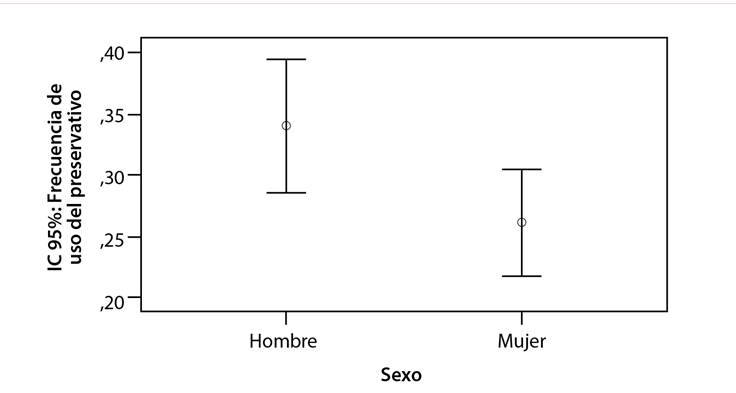 Figura 1 Comparación de la estimación de prevalência e intervalos de confianza del 95% de uso del preservativo entre hombres y mujeres.
