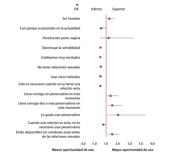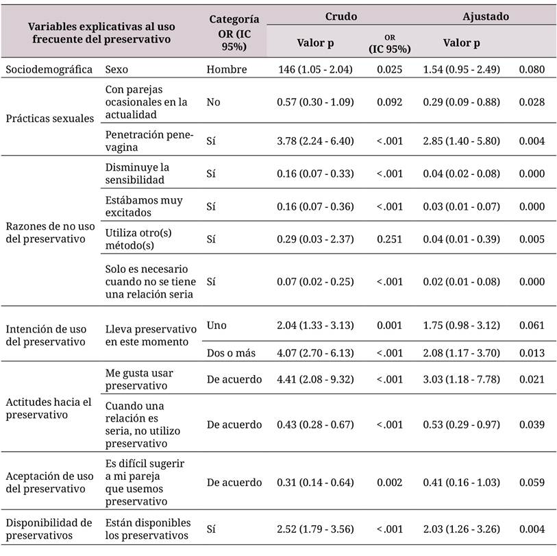 Según el modelo final, los hombres utilizan más el preservativo en comparación con las mujeres (or = 1.54, 1095 %: 0.95-2.49). Los jóvenes sin parejas ocasionales tienen 71 % menos oportunidad de usar preservativo (or = 0.29, 1095 %: 0.09-0.88). En los jóvenes con prácticas sexuales pene-vagina hay 2.85 veces la oportunidad de usar siempre el preservativo respecto a los jóvenes sin esta práctica sexual (or = 2.85, 1095 %: 1.40-5.80). Los jóvenes que consideran en las razones de no uso del preservativo: la disminución de la sensibilidad tienen un 96 % menos oportunidades de usar siempre el preservativo (or = 0.04, 1095 %: 0.02-0.08); no uso por excitación, un 97 % menos oportunidades de usar el preservativo (or = 0.03, 1095 %: 0.01-0.07); uso de otros métodos, un 96 % menos oportunidad de usar preservativo (or = 0.04, 1095 %: 0.01-0.39); no es necesario cuando se tiene una relación seria, un 47 % menos oportunidad de usar el preservativo (or = 0.53, 1095 %: 0.29-0.97).