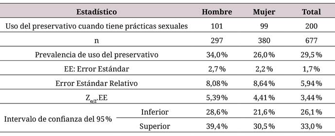 Sobre el uso del preservativo, 200 jóvenes universitarios manifestaron utilizarlo "Algunas veces" o "Siempre"; mientras que 477 respondieron no utilizarlo en la categoría "Nunca"; de tal manera que se obtuvo una prevalencia de uso del 29.5 %, con un error estándar de 1.75 %, error estándar relativo de 5.94 % y un intervalo de confianza que osciló entre 26.1 % y 33.0 %. (Tabla 2)