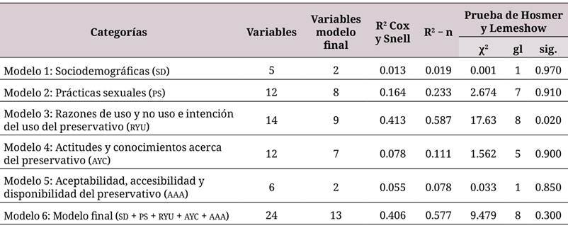Además, para el análisis del modelo explicativo, la inclusión y exclusión de variables estuvo mediada por el criterio del investigador y en todo momento se consideró el criterio de la literatura. El punto de corte de inclusión de variables fue el valor de p ≤ 0.25 16. Para el modelo final, el método de inclusión de variables fue "Introducir", seleccionando las variables con un valor de valor de p ≤ 0.10 17. Posterior a la obtención del modelo múltiple final, se evaluó el ajuste a través de las pruebas de Hosmer y Lemeshow, R2 de Cox y Snell y R2 de Nagelkerke 18. Cada modelo por categorías se comparó con el inmediatamente anterior, a fin de determinar cuál modelo explica en mayor grado la probabilidad de uso del preservativo a partir de las variables incluidas. Finalmente, se interpretó el modelo a través de los coeficientes exponenciados para obtener los odds ratio (OR) y sus intervalos de confianza (95 %). Por último, se utilizaron el programa estadístico SPSS versión 26, cuadros y gráficos en Excel para el análisis estadístico.