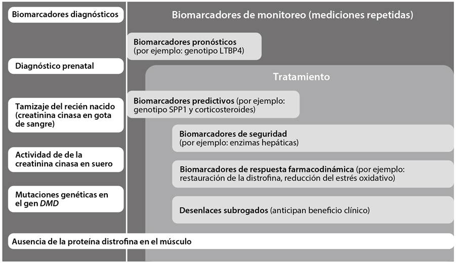A pesar de haber sido descritos hace mucho tiempo, en nuestro entorno el uso de biomarcadores "de monitoreo" no es rutinario, principalmente por los costos asociados. Sin embargo, es importante tener en cuenta que los biomarcadores genómicos, como la proteína 4 de unión latente al factor de crecimiento transformante tipo p ( LTBP4), identifican modificaciones genéticas que se correlacionan con la edad de pérdida de la deambulación, independientemente del tratamiento con esteroides 21,22. La LTBP4, a su vez, estimula la expresión de fosfoproteína secretada 1 (SPP1) en los mioblastos. El spp1 es un marcador de predicción, en el cual un genotipo particular (genotipo G) tiene una relación con la pobre respuesta a corticosteroides 23,24.