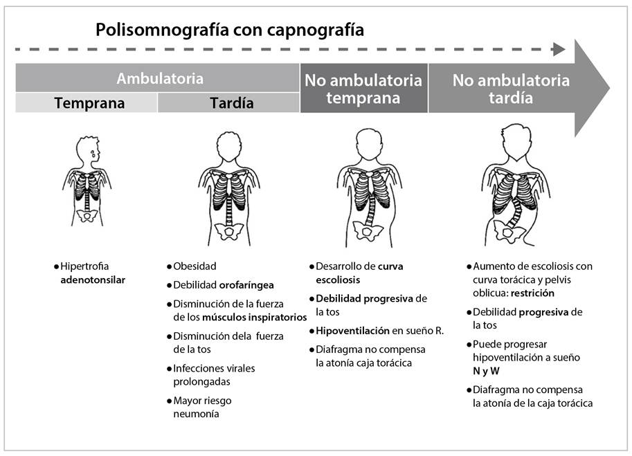 A medida que el paciente progresa a la fase no ambulatoria, en estadios tempranos y en pacientes asintomáticos, disminuye la capacidad vital forzada (CVF) del 60 % al 70 %. Hay factores capaces de aumentar la frecuencia de presentación de los TRS, como la escoliosis, la debilidad progresiva de los músculos inspiratorios y luego de los espiratorios, y causar mayor hipoventilación en el sueño R. Algunos mecanismos contrarreguladores, como los microdespertares con las desaturaciones y la taquipnea, hacen que no se presente hipoventilación, por lo que se les denomina marcadores tempranos de hipoventilación31.