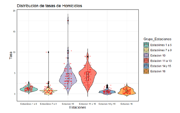 Por otra parte, las tendencias en las tasas de delitos de alto impacto en el contexto analizado no muestran un comportamiento homogéneo. Las medidas de aislamiento implementadas debido a la pandemia de Covid-19 provocaron una disminución significativa en las tasas de delitos, de modo que los hurtos a personas alcanzaron sus mínimos en abril del 2020 en todos los puntos geográficos analizados. Comportamiento similar presentaron las lesiones personales, a excepción de las estaciones 14 y 15, donde las tasas más bajas se registraron a inicios del 2023. En cuanto al hurto comercial, los mínimos se distribuyen desde el periodo de aislamiento hasta el 2023, registrando las estaciones de la 7 a la 13 sus tasas más bajas en abril del 2020, mientras que las estaciones de la 1 a la 6 y de la 14 a la 16 lo hicieron en el 2023. El caso de los homicidios es diferente ya que las menores tasas se registraron en diversas ocasiones a lo largo de los seis años bajo estudio.
