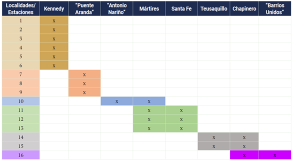 Se usó Excel para consolidar los datos teniendo en cuenta la disposición geográfica de las estaciones (Tabla 1). En los casos en los que una localidad tenía múltiples estaciones, se consolidaron los datos mensualizados de los delitos en un único conjunto, mientras que las estaciones que se encuentran en dos localidades se agruparon condensando los datos de estas en uno. Así, quedaron seis grupos con datos mensualizados. Lo siguiente que se hizo fue la conversión de los números totales en sus respectivas tasas por 100 000 habitantes para poder tenerlas como medida de análisis de los resultados. Los datos de las poblaciones en los diferentes grupos y años se obtuvieron de la Secretaría Distrital de Planeación, que establece el comportamiento poblacional según el Censo Nacional de Población y Vivienda del 2018, realizado por el DANE (2023).