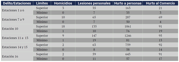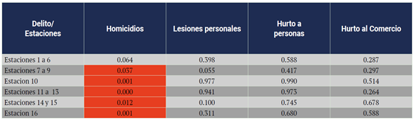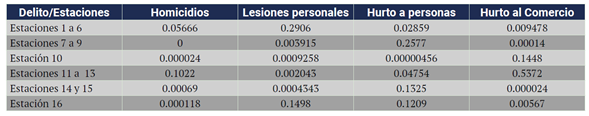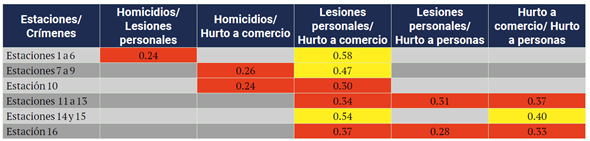 En las estaciones 1 a 6 la correlación entre homicidios y lesiones personales es débil. Lo mismo pasa con las correlaciones entre homicidios y hurtos a comercios en las estaciones 7 a 9 y 10; entre lesiones personales y hurto a personas en la estaciones 11 a 13 y 16; entre hurto a comercio y hurto a personas en las estaciones 11 a 13 y 16, y entre lesiones personales y hurto a comercio en las estaciones 10, 11 a 13 y 16. Por otro lado, las correlaciones son moderadas entre lesiones personales y hurto a comercio en las estaciones 1 a 6, 7 a 9 y 14 y 15, así como entre hurto a comercios y hurto a personas en las estaciones 14 y 15 (Tabla 7).
