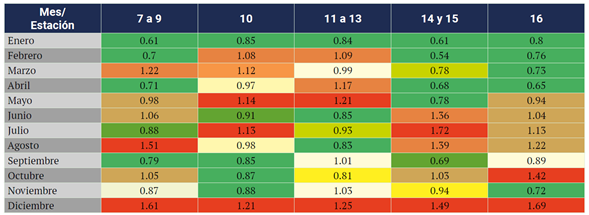 Tabla 5 Índice de estacionalidad de la tasa de homicidios por 100 000 habitantes del 2018 al 2023 en las localidades de las estaciones de la PLMB