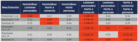 La prueba de Spearman, con un 95 % de confianza, señala que existe correlación entre lesiones personales y homicidios en las estaciones 1 a 6; entre homicidios y hurto a comercio en las estaciones 7 a 9 y 10; entre lesiones y hurto a comercios en todos los grupos de estaciones; entre lesiones y hurto a personas en las estaciones 11 a 13 y 16, y entre hurtos a comercio y hurto a personas en las estaciones 11 a 13 (Tabla 6).