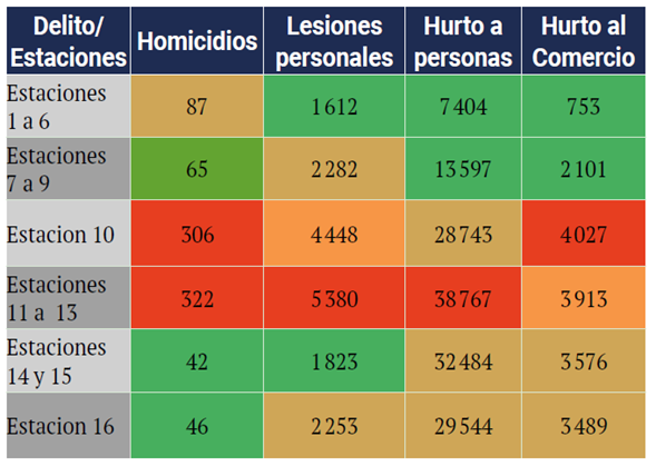 Mientras tanto, en el centro-norte de la ciudad se concentran la tasa de hurto a personas por 100 000 habitantes (86.04 %) y la de hurtos a comercio (84 %). A su turno, las estaciones del centro por una gran diferencia concentran la mayor tasa de lesiones personales por cada 100 000 habitantes (55 %).