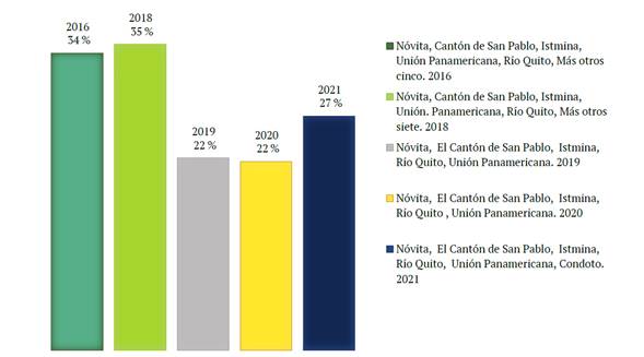 Es necesario considerar que la explotación ilícita de oro aluvión en el Departamento del Chocó representó, en 2021, el 78.7 % de las hectáreas (Unodoc y Minenergía, 2022), mientras que, para 2022, Chocó seguía ocupando el primer lugar con Evoa, con 37 841 hectáreas que corresponde al 40 % del consolidado nacional y sigue siendo la región donde más se focaliza la explotación ilícita, con 33 938 hectáreas, lo que quiere decir el 89.68 % de las hectáreas estaba utilizándose en estas prácticas (Unodc, 2023). Uno de los negocios ilegales que rodea a la minería ilegal es el del cultivo de coca. Para 2022, ocho de los diez municipios con mayor Evoa contaban con estos cultivos (UNODC, 2023). En Río Quito, desde 2015 hasta 2021, no registraba tales cultivos, pero en 2022 volvió a contar con ellos -Figura 1 (Unodoc yASWWE Minenergía, 2022; Unodc, 2023).
