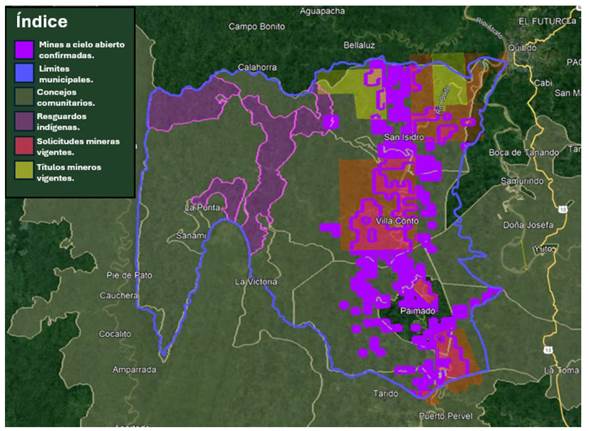 Figura 2 Mapa de la distribución de la minería ilegal en el municipio de Rio Quito, Chocó, 2023