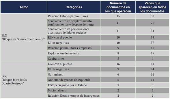 Tabla 2 Categorías discursivas utilizadas por el Ejército de Liberación Nacional y el Ejercito Gaitanista de Colombia
