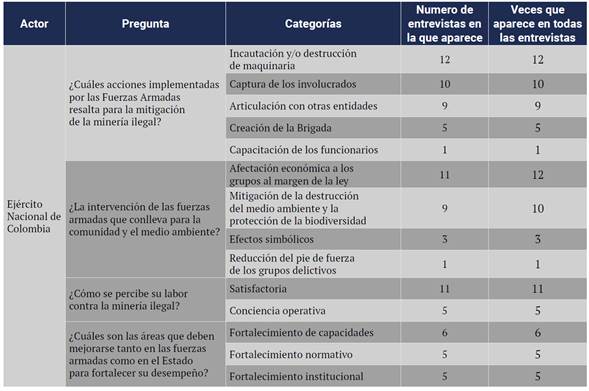 El último actor identificado es la Brigada Contra la Explotación Ilícita de Yacimientos Mineros del Ejército Nacional. Su caracterización incluye una revisión de los medios de comunicación y entrevistas estructuradas con los miembros de la brigada. Estas se centraron en comprender las acciones de las fuerzas, su percepción de impacto en la comunidad y el medioambiente, así como su autopercepción y las áreas de mejora identificadas que podría llevar a cabo el Estado, por ejemplo, con el Ejército, para mejorar su actuación. Los resultados de estas entrevistas se categorizaron para su posterior también mediante la herramienta MAXQDA.